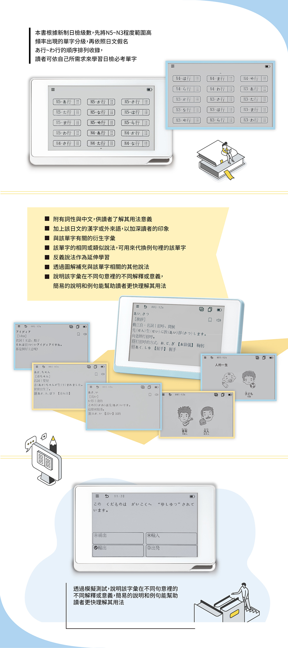 除了單字和例句之外,還有反義字和衍生字,再加上收錄了很多很可愛的圖表,搭配這些內容一起看,就能夠把很多單字更有效率的背起來。一邊搭配日文老師標準發音的朗讀單字mp3,就可學到正確的日文發音。每一個級數結束之前,還有一回針對言語知識(文字&語彙)的模擬測驗,題型及題數皆仿照正式的日語能力測驗,幫助讀者先熟悉測驗方式,以期在正式測驗中能快速進入作答模式。