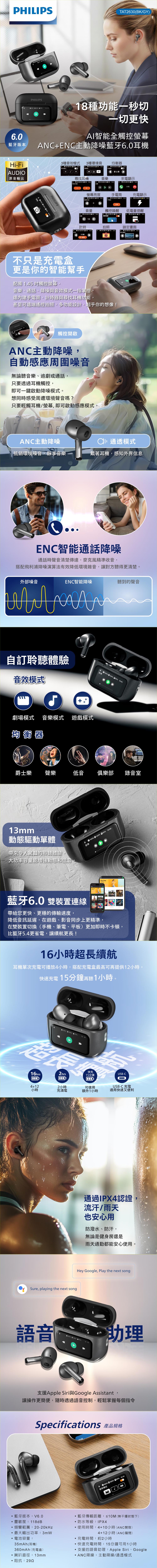 首頁 / 真無線藍牙耳機 / PHILIPS飛利浦 觸控螢幕真無線耳機 TAT2630 PHILIPS飛利浦 觸控螢幕真無線耳機 TAT2630NT$1,980 1.45 吋觸控充電盒,一盒掌控音樂、通話、降噪、音效模式等 18 項智慧功能 ANC 主動降噪+感應模式,沉浸或環境聲一指切換 ENC 智能通話降噪,麥克風精準收音、對話更清晰 最新藍牙 6.0,雙裝置高速連線、低延遲更省電 16 小時長續航+快充與 IPX4 防汗防雨,全天候使用無負擔 顏色 請選取一個選項錆色黑色錆色黑色清除 PHILIPS飛利浦 觸控螢幕真無線耳機 TAT2630 數量 加入購物車 貨號: PHILIPS TAT2630 分類: 真無線藍牙耳機 品牌: PHILIPS 描述 額外資訊 規格說明 描述 額外資訊 品牌 PHILIPS飛利浦 規格說明商品規格 藍牙版本:V6.0 靈敏度:118dB 頻響範圍:20-20kHz 最大輸出功率:3mW 電池容量:35mAh(耳機) 360mAh(充電盒) 喇叭直徑:13mm 阻抗:29Ω 藍牙傳輸距離:≤10M(無干擾狀態下) 防水等級:IPX4 使用時間:4 10小時(ANC開啟) 4 12小時(ANC關閉) 充電時間:約2小時 快速充電時間:15分鐘可用1小時 支援的語音助理:Apple Siri、Google ANC降噪:主動降噪/通透模式 BSMI證號:R3H210 NCC號碼:CCAN25LP1250T5 相關商品 iSee Airduos TWS Earbuds V5.0雙耳觸控真無線藍牙耳機 NT$990 iSee Airduos Lite TWS Earbuds V5.0真無線立體聲藍牙耳機 NT$1,290 JLab JBuds Air Play 真無線藍牙電競耳機 NT$2,799 JLab JBuds Air Executive 真無線藍牙耳機 NT$2,799